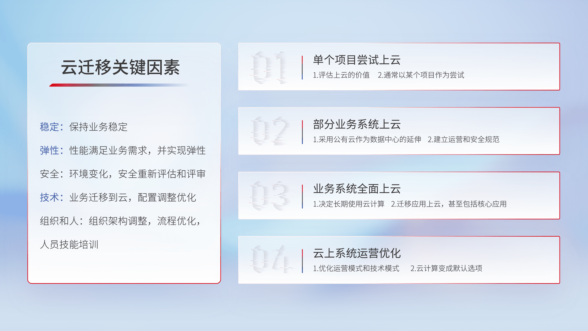 结合实际业务,,,从规划设计、、云平台选型、、云原生改造、、、数据迁移、、、集成交付,,迁移全过程为客户识别最佳上云路径,,,,做好风险识别管理,,,,设计网络架构、、身份权限、、、、安全审计合规、、操作审计、、日志审计、、监控告警策略、、、、多站点容灾设计等,,,,对云上基础设施进行整体规划,,提升IT治理水平,,,,以满足弹性、、、、高可用、、、、高性能的需求。。