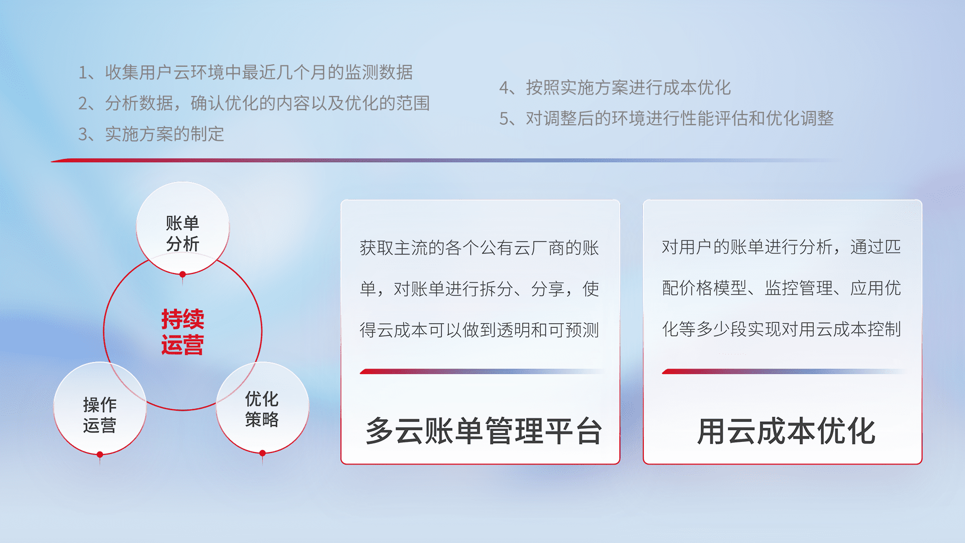 通过多云纳管,,,以统一的资源数据模型把客户的云资源进行抽象和封装,,,,进而实现对多云资源的统一操作,,保障云资源管理的可靠性、、、、稳定性与可用性。。。。量身定制化运维内容,,,配置、、、、开发运维、、、补丁管理、、备份、、、监控、、、、认证和访问管理、、、审计和日常巡检等,,,保障在用云过程中的可靠度,,,稳定度以及高可用率。。。。