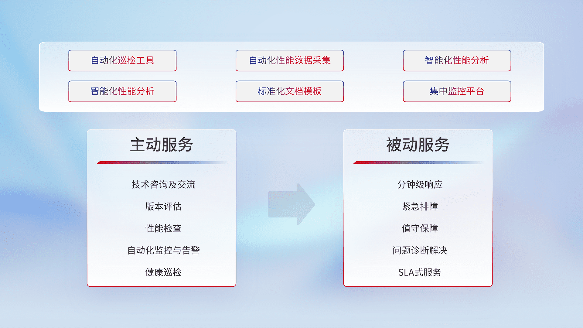 智能化工具和标准化文档,,保障服务质量,,,提供主动服务(包含技术咨询、、、版本评估、、、性能检查、、、自动化监控与告警、、、、健康巡检)和被动服务包含(分钟级响应、、、、紧急排障、、值守保障、、问题诊断解决、、SLA服务)。。